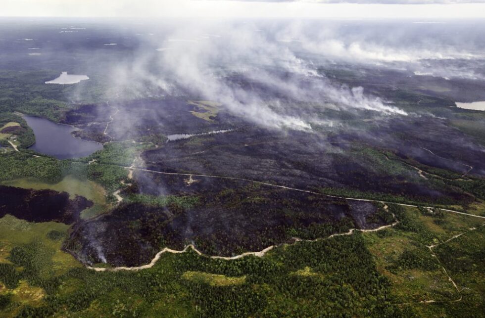 Aerial view shows the northern edge of the fire that jumped West Dalhousie Road and the dozer guard around it, on August 21, 2025. (Province of Nova Scotia)