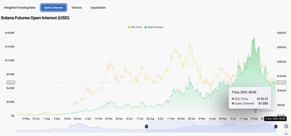 Derivatives data shows why this bounce stands out. CoinGlass reports SOL futures open interest near $7.5Bn, with about $17Bn in 24-hour futures turnover.